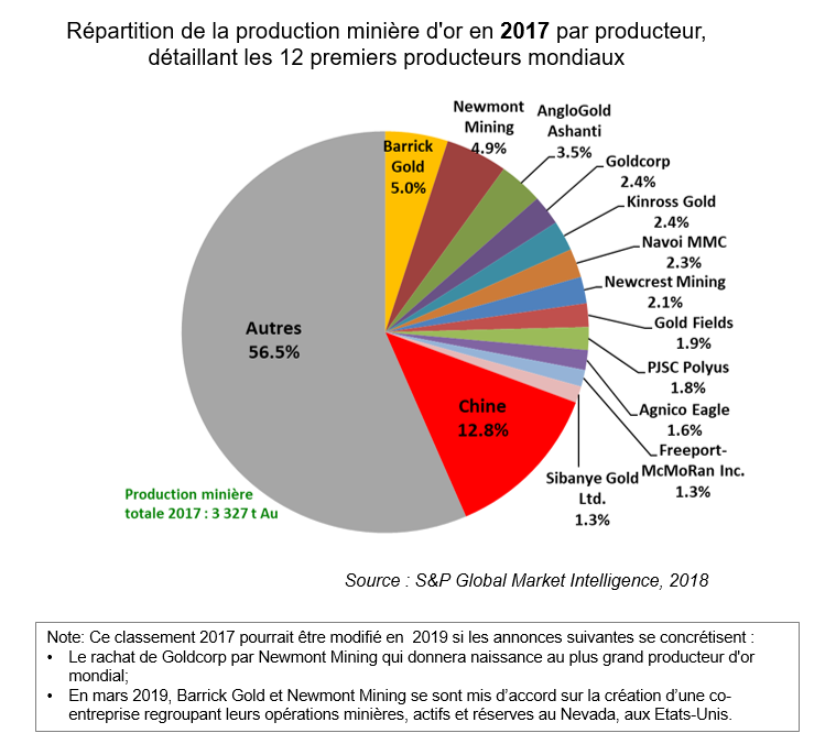 Répartition de la production minière d'or en 2017 par producteur, détaillant les 12 premiers producteurs mondiaux