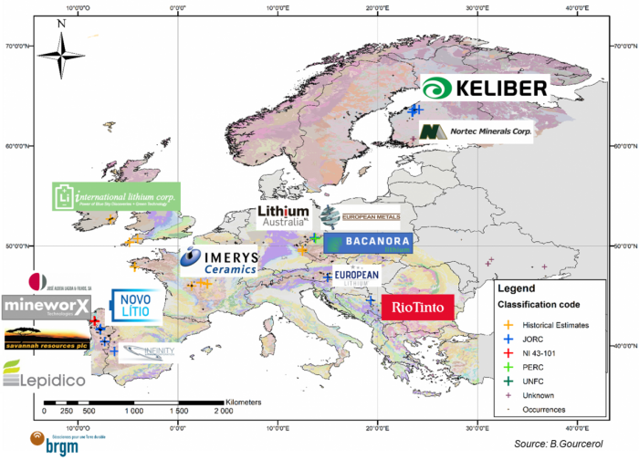 Ces gisements ont été évalués dans un système CRIRSCO (ex: JORC, NI 43-101), ou sont en cours d’évaluation ou bien encore ont été évalués dans le passé (ressources historiques) tels que Beauvoir et Montebras en France (ressources évaluées à 1 000 t de Li métal) ou St Austell en Angleterre (ressources évaluées à 16 000 000 t de Li métal) à travers les services géologiques nationaux. Ces gisements sont principalement associés à des minéraux lithinifères (lépidolite, spodumène, pétalite etc.) issus de pegmatites ou coupoles granitiques d’âges protérozoïque à cénozoïque (phase Alpine) et consistent également en des gisements dits « non-conventionnels », comme le projet Jadar.