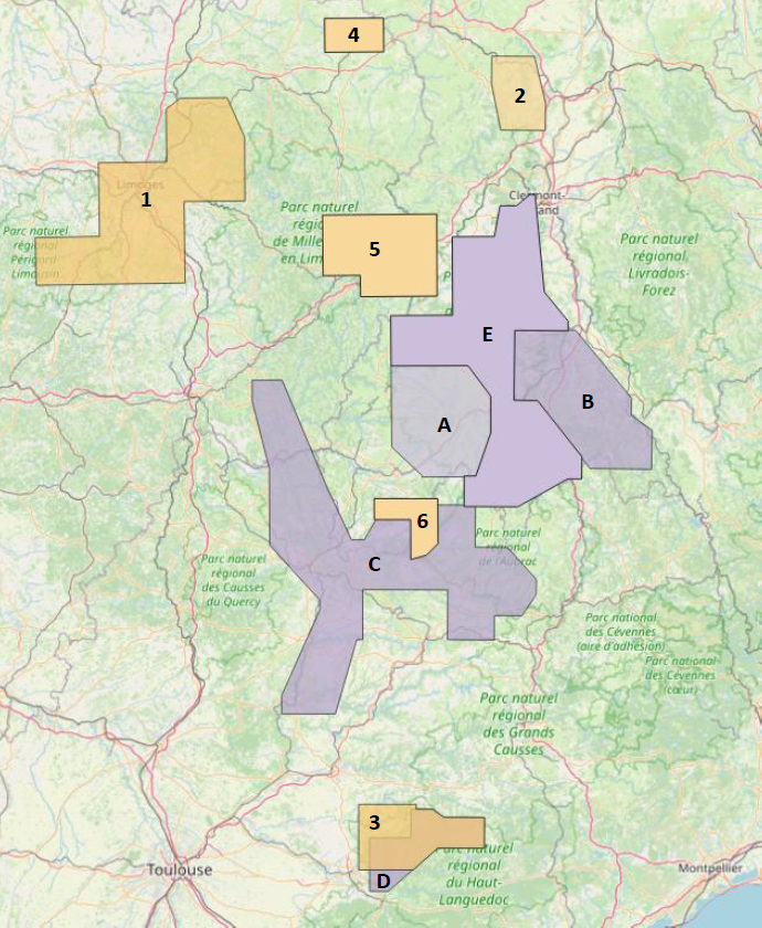 Les surfaces survolées en 2022, sur lesquelles des données géophysiques sont disponibles sont représentées cartographiquement ci-dessous. Les secteurs en jaune et numérotés disposent de données électromagnétiques et magnétiques, tandis que les secteurs en violet et lettrés disposent de données magnétiques et radiométriques.