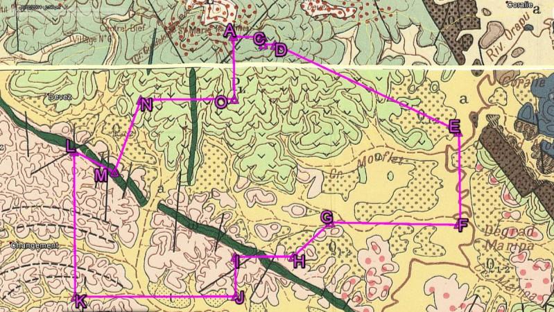 Capture de la carte du périmètre demandé pour permis exclusif de recherches de mines dit "Permis Olivet", sur fond de carte géologique.