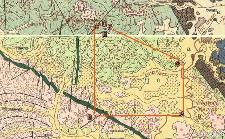 Capture de la carte du périmètre demandé pour permis exclusif de recherches de mines dit "Permis Penlan", sur fond de carte géologique.