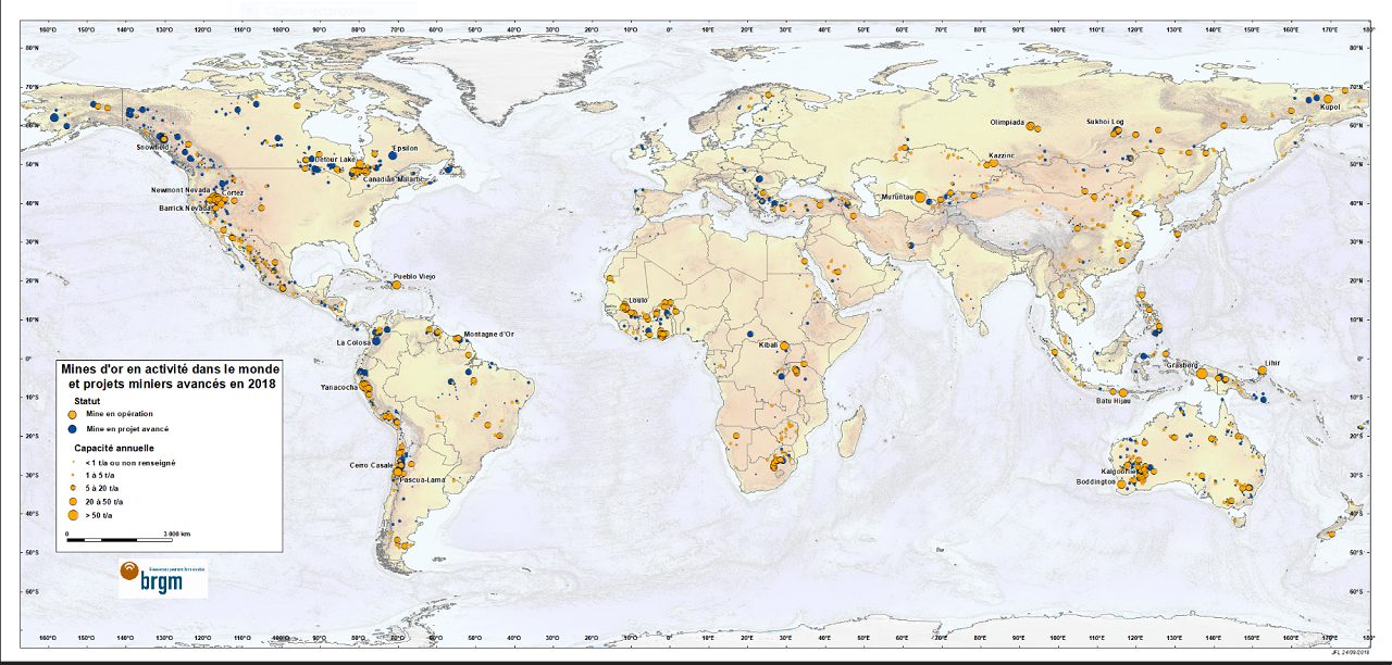 La carte ci-dessous indique la répartition des principales mines d'or du Monde. Elle indique 848 mines en opération, intégrant les plus importantes, mais elle n'est pas exhaustive. La production cumulée rapportée de ces mines a été de 2 397 tonnes d'or, alors que la production minière mondiale est évaluée, selon les auteurs, à 3 298 à 3 327 t (cf. plus haut). La carte indique aussi 1 629 projets miniers plus ou moins avancés.