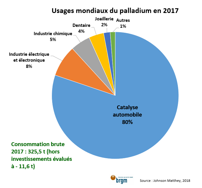 La demande brute en palladium a affiché une hausse de 4,7 % en 2017 par rapport à 2016 à environ 325,5 t (hors investissements à -11,6 t, assimilables à un déstockage avec remise du métal sur le marché). Cette hausse est soutenue par une forte demande pour l’industrie chimique et la catalyse automobile, malgré la baisse de la demande des autres secteurs, comme la joaillerie et l’industrie électrique et électronique. La demande brute en palladium pour la catalyse a enregistré une hausse de 5,7% sur un an (à 261 t), renforçant encore plus la domination de ce secteur sur le marché du métal qui représente maintenant environ 80 % des usages.