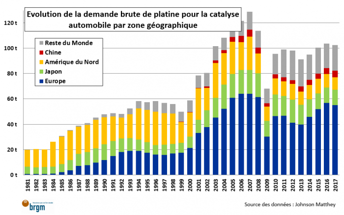 La demande cumulée en platine, palladium et rhodium pour la catalyse automobile est passée de 68 t en 1990 à 390 t en 2017 et ce secteur représentait 65 % de la demande totale en platinoïdes en 2017. Cependant, ces chiffres masquent des tendances bien différentes selon les métaux concernés.