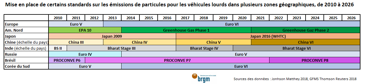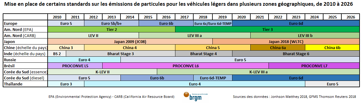 Les tableaux ci-dessous sont des compilations non-exhaustives de la mise en place de standards sur les émissions de particules pour les véhicules légers d’une part et lourds, d’autre part, de 2010 à 2026.