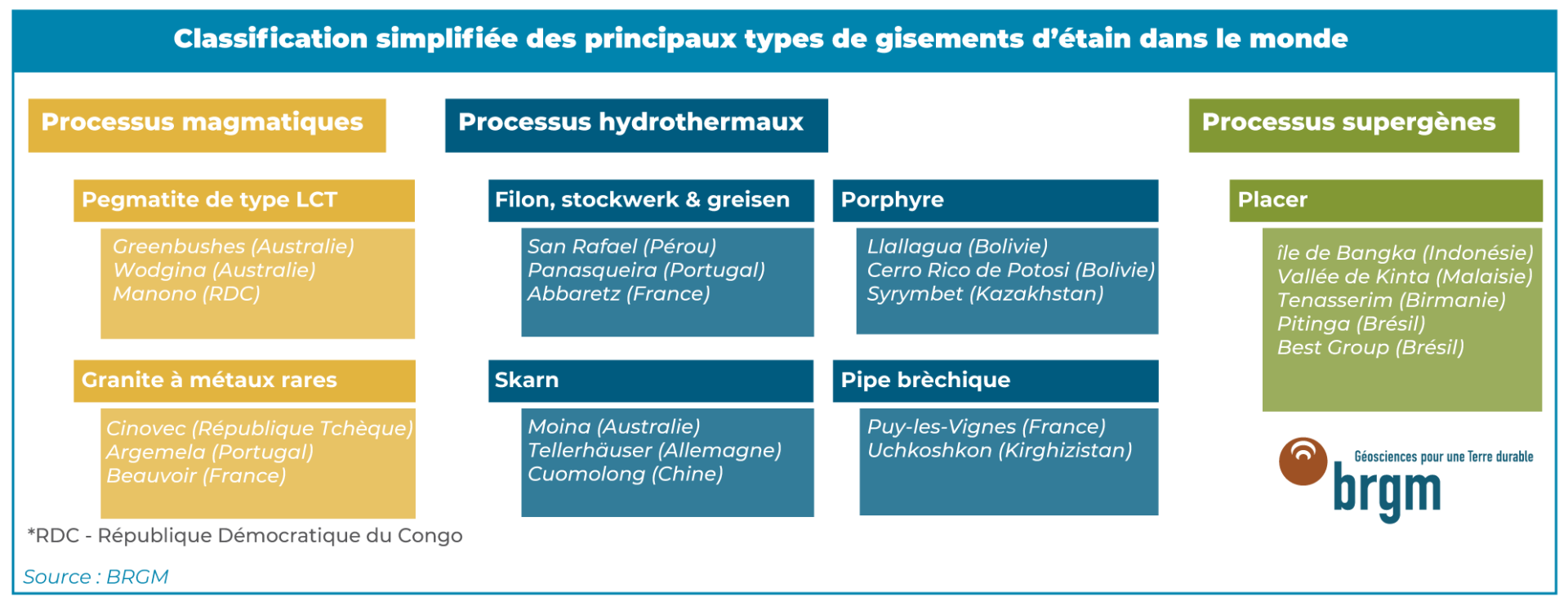 Les gisements primaires d’étain, qui alimentent un peu plus de la moitié de la production mondiale, sont majoritairement associés à la mise en place et à la cristallisation d’intrusions granitiques issues de la fusion partielle de la croûte continentale. Les minéralisations primaires en étain sont, soit (1) hydrothermales, soit (2) magmatiques. A noter qu’une petite quantité d'étain est récupérée en tant que sous-produit dans des gisements à Cu-Zn (gisements d’amas sulfurés (VMS) par exemple), comme à Neves Corvo, au Portugal. L’autre moitié de la production mondiale provient des gisements secondaires de type alluvionnaire (également appelés placers) qui résultent de l’altération chimique et mécanique des roches primaires, suivie d’épisodes de transport et de dépôt. Une brève description de chaque type de gisements est synthétisée et illustrée sur la figure3.