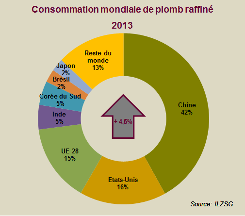 La demande mondiale en plomb raffiné a repris sa croissance en 2013 avec une augmentation de 4,5 % par rapport à 2012, à 10 615 kt. Cette demande a été tirée par les Etats Unis (+16 % à 1 739 kt), la Chine (+4,9 % à 4 452 kt), l’Union Européenne (+3,5 % à 1 557 kt) et la Corée du Sud (+11,5 % à 478 kt).