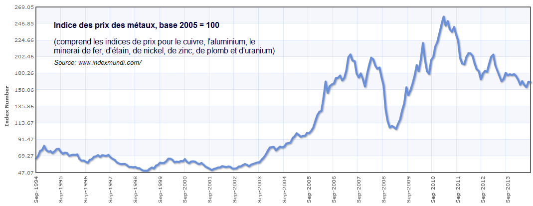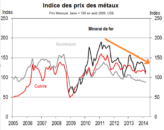 Le contexte économique global est donc encore pro parte celui d’un bas de cycle économique, avec des matières premières minérales en surplus (et des stocks élevés) en raison à la fois d’une faible croissance de la demande (Chine), du démarrage de nouvelles capacités de production (minerai de fer, de cuivre, de chromite, etc.) et un dollar fort. En conséquence, l’indice des prix des métaux a ainsi perdu 9,6% sur un an.