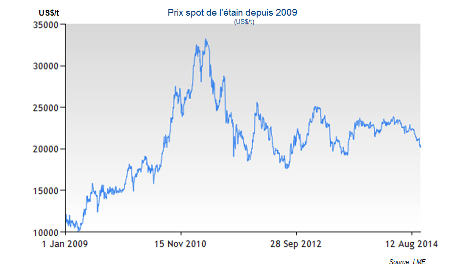 Toutefois, plusieurs produits miniers sont exposés à des volatilités conjoncturelles, qui viennent contrarier cette tendance structurelle baissière des prix. Il s’agit du tantale et de l’étain (loi Dodd-Frank sur l’interdiction d’usage des minerais de conflit de la région des grand lacs de la RDC et de ses pays limitrophes), de l’étain et du nickel (nationalisme des ressources en Indonésie), voire du palladium (sanctions économiques contre la Russie). Par contre, pour le platine, la tragique grève des mineurs d’Afrique du sud, n’a cependant pas eu d’effet haussier sur les cours du platine en raison de fondamentaux peu favorables (voir section PGM).