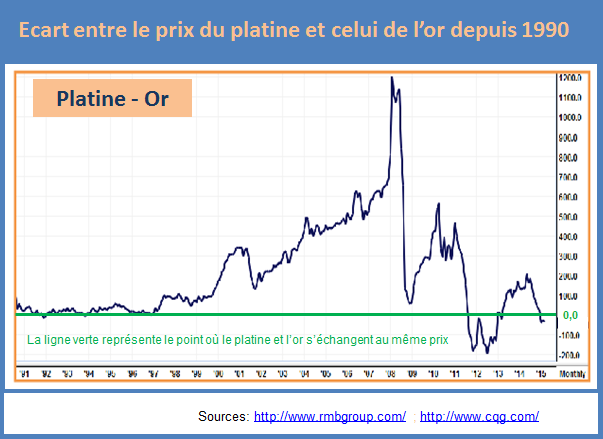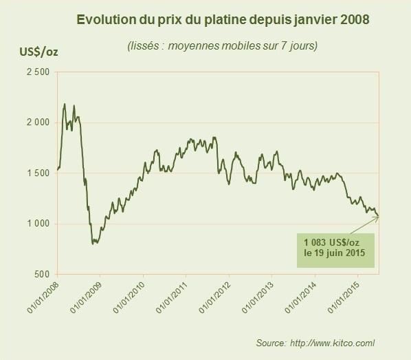 Le platine, tout comme les autres métaux précieux, a souffert de la hausse du dollar américain et du désintérêt des investisseurs. Les prix ont continué à s’écrouler en 2015 (1 083 US$/oz le 15 juin 2015, son niveau le plus bas depuis mars 2009).