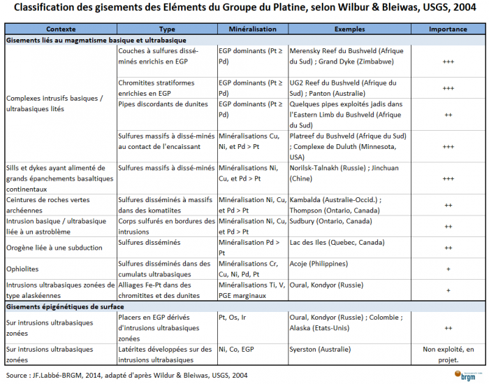 Les gisements de platinoïdes sont toujours liés à des roches magmatiques basiques ou ultrabasiques (roches sous-saturées en SiO2)2 d’origine mantellique, et aux placers3 qui résultent de leur érosion et du dépôt sédimentaire des minéraux à platinoïdes. Mais si les types de gisements sont bien identifiés, leur classification et leur regroupement en familles varient selon les auteurs.