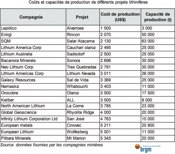 En termes de comparaison des coûts de production à l’échelle mondiale, on note que les projets liés à des minéraux lithinifères montrent à ce jour en moyenne un coût plus fort et de plus faibles quantités de production par rapport à des projets associés à des saumures et des minéraux « non-conventionnels ». Le défi de l'abaissement des coûts de production est à relever pour les compagnies minières juniors afin d’être compétitives sur ce marché. Cependant, les possibles coproduits et sous-produits tels que le tantale, l’étain ou le tungstène, dans le cas des gisements de minéraux lithinifères, peuvent être un atout important. De plus, même dans l'hypothèse d'une stabilisation voire d'une diminution du prix du carbonate de lithium dans les années à venir (6 900 US$/t en 2020 selon les prévisions Deutsche Bank), l'évaluation actuelle des projets européens indique qu'ils pourraient demeurer rentables dans ces conditions.