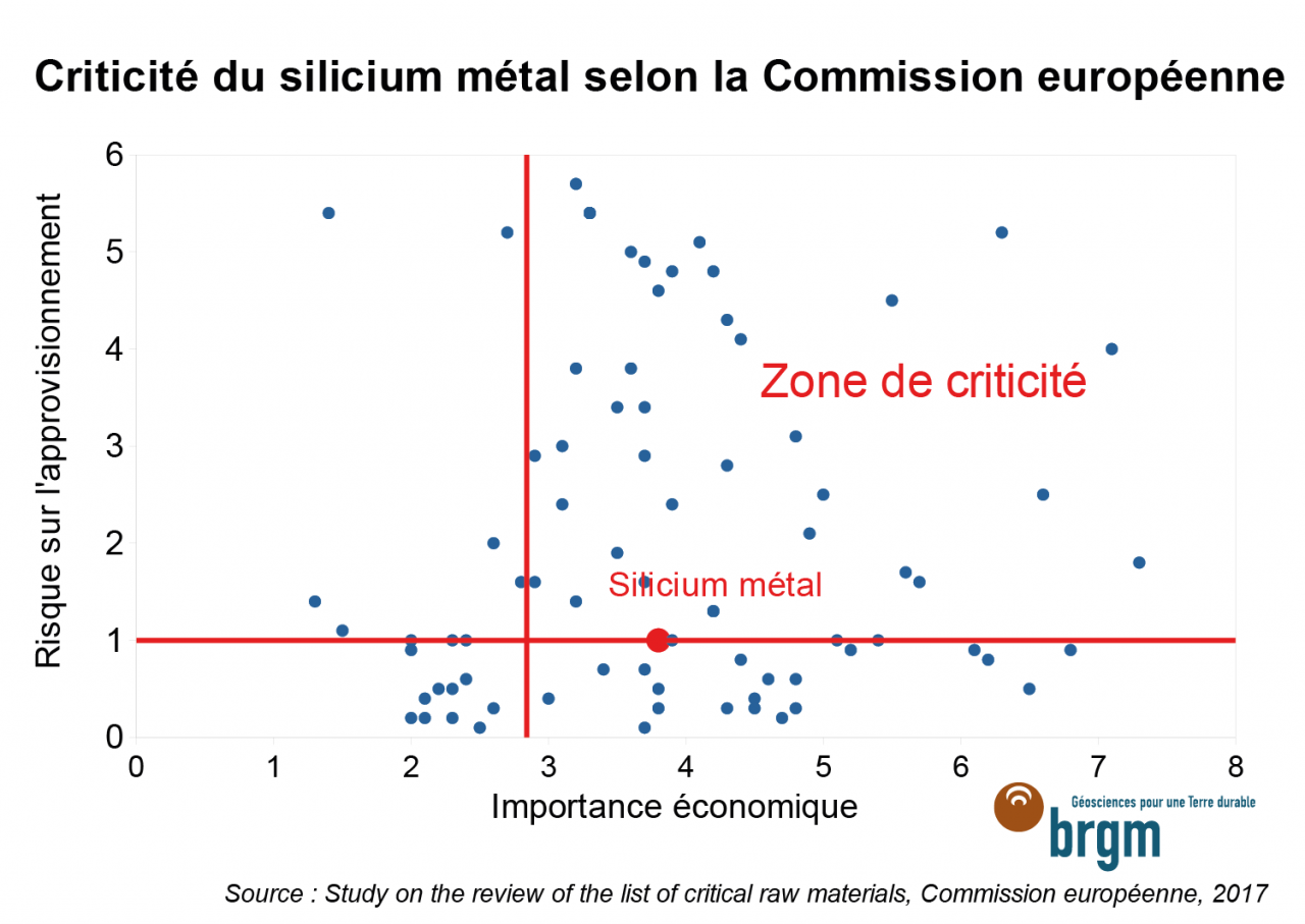 A l'échelle de la France, le BRGM a réalisé la première édition de la fiche de criticité du silicium métal en 2019 [10] en faisant une synthèse des différents enjeux sur l’amont de la chaîne et leurs perspectives d’évolution. Ont été reconnus l'importance économique du silicium métal pour l'industrie française ainsi qu'un risque modéré sur les approvisionnements. Rappelons que la France produit du silicium métal sur son sol et dispose de ressources en quartz de haute pureté.