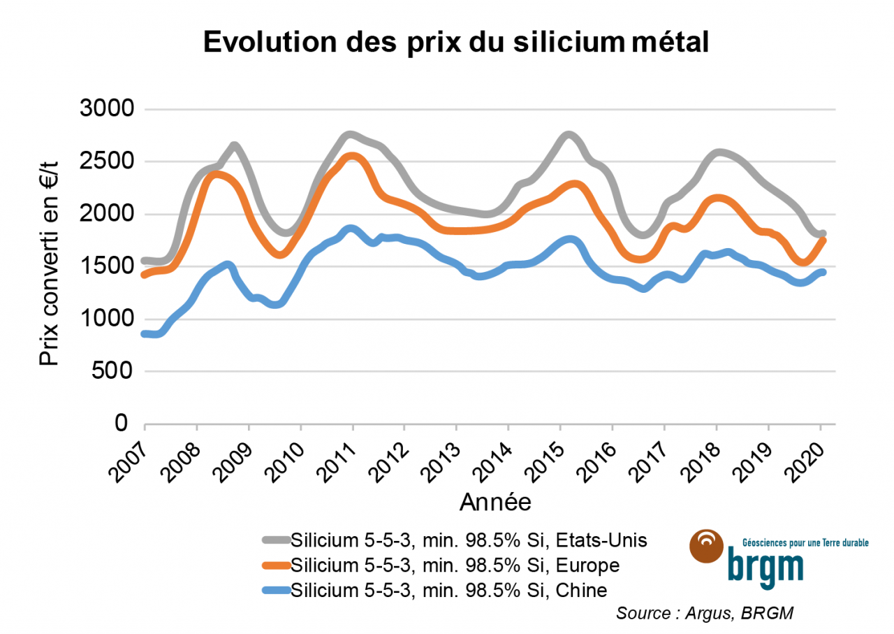 Le marché du silicium métal est reconnu comme étant cyclique. Lorsque les prix baissent et se rapprochent des coûts de production, le marché se réorganise et les acteurs tendent à limiter leur production. Le prix du silicium métal est moins élevé en Chine mais également moins volatile qu'en Europe et aux États-Unis.