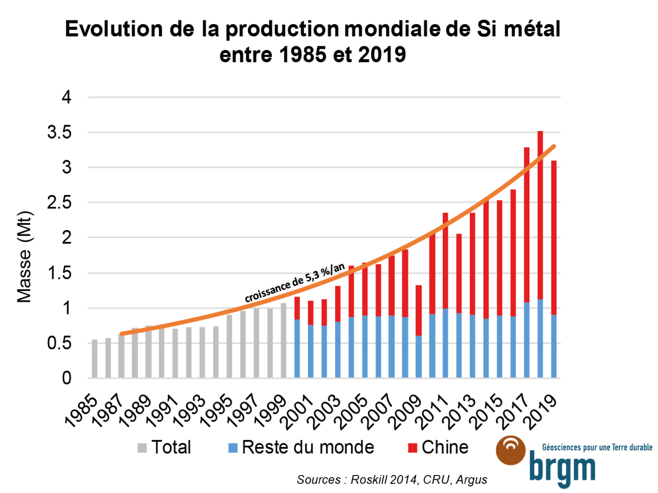 La production de silicium métal a suivi une croissance relativement stable sur les 30 dernières années, à près de 5 %/an. Il semble cependant que la production ait reculé en 2019, à environ 3,1 Mt (BRGM). La Chine est depuis plusieurs décennies le plus gros producteur de silicium métal avec 2,2 Mt en 2019 selon Argus, soit 71 % de la production mondiale. Les autres principaux producteurs sont le Brésil (200 kt), la Norvège (170 kt), les États-Unis (135 kt), et la France (100 kt).