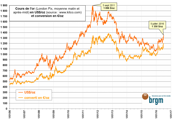 À partir de 2006, l’or a atteint des prix historiquement hauts avec un paroxysme en septembre 2011, où son prix a frôlé 1 900 US $/oz. Après une longue chute, le début de l’année 2016 marque une remontée significative, les prix ayant atteint 1 350 $/oz en juillet (le plus haut depuis mars 2014).