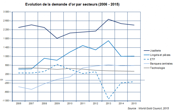 La demande mondiale d’or est répartie entre cinq secteurs majeurs, qui en 2015 représentaient un total de 4 212 t, en légère baisse par rapport à 2014 (4 226 t). Parmi ces secteurs, on distingue la joaillerie et les applications technologiques, qui représentent des parts relativement stables et prévisibles de la demande totale, respectivement autour de 55-60 % et 8 %. En revanche, les secteurs liés à l’investissement c’est-à-dire au rôle financier de l’or sur les marchés (achat de pièces et lingots, stocks des banques centrales, ETF), peuvent présenter des variations importantes d’une année sur l’autre, car ils dépendent avant tout d’événements macroéconomiques. La demande associée est le facteur majeur d’évolution des prix.