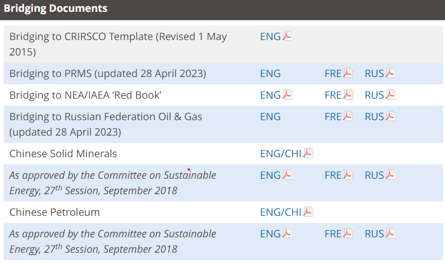 La Classification-cadre des Nations Unies pour les ressources (UNFC) est expliquée en détail dans des documents (Guidelines) publiées par l'UNECE.