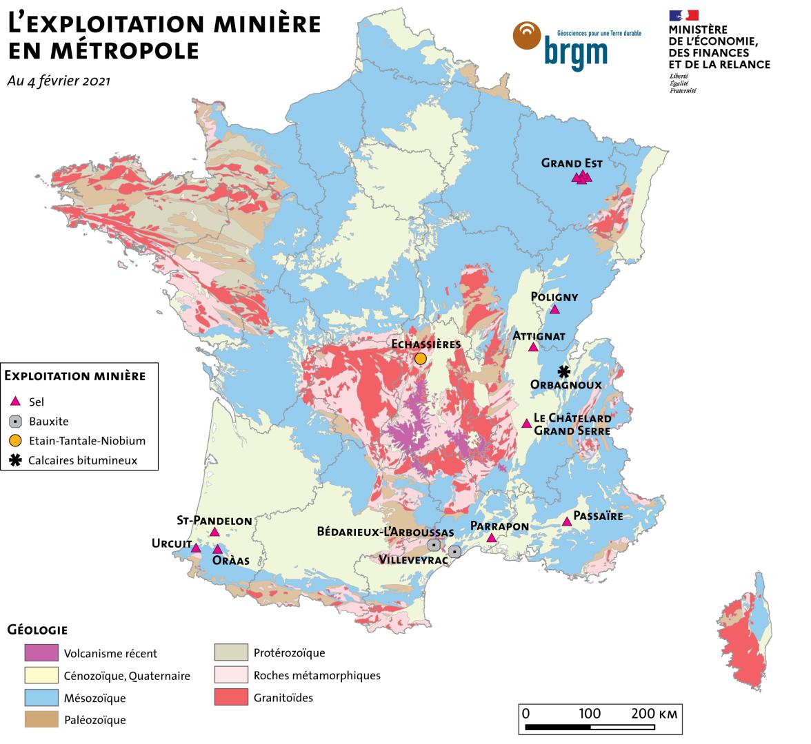 Des mines sont toujours exploitées en métropole (sel, bauxite, calcaires bitumineux, étain-tantale-niobium), en Guyane (or) et en Nouvelle-Calédonie (nickel).