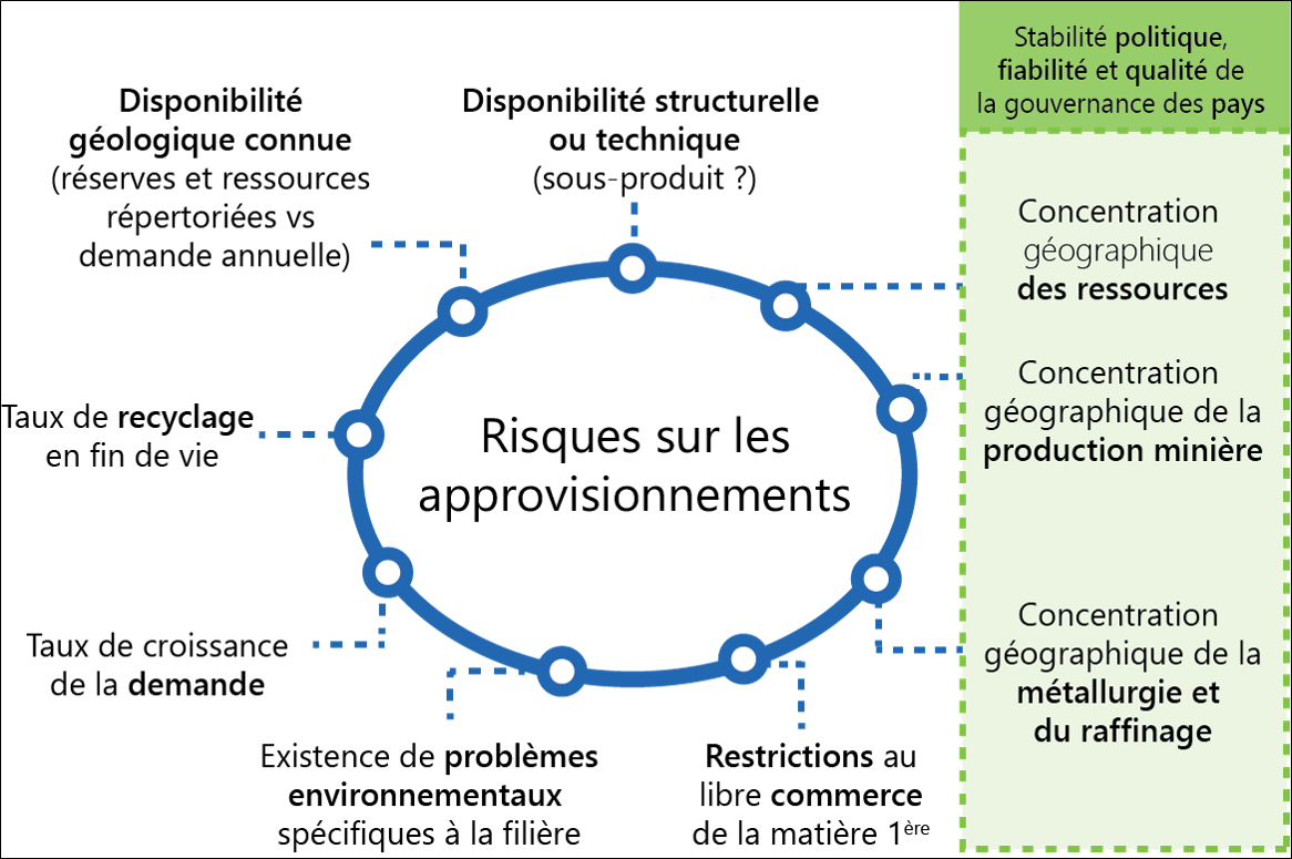 Les risques d'approvisionnement se distribuent sur toute la chaîne de valeur. Celle-ci commence avec la découverte géologique d’une ressource valorisable, puis sa mise en exploitation pour aboutir à la production et la commercialisation d’un produit qui peut être un système parfois très complexe, tel qu’un avion ou une voiture, comportant donc de nombreux sous-ensembles. Chaque maillon de la chaine de valeur est appréhendé afin d'analyser les risques qui pèsent sur cette phase. Les risques sont nombreux, comme l'illustre le schéma ci-contre. Le potentiel de recyclage et de substitution peuvent mitiger les risques de disponibilité des produits miniers et s'inscrit dans la démarche positive de l'économie circulaire