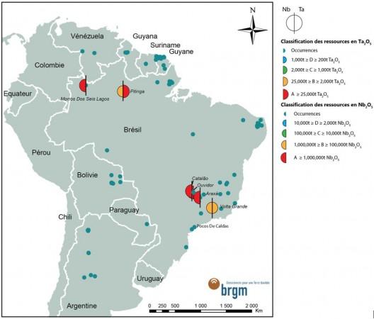 Distribution des différents indices et gisements de tantale et niobium en Amérique du Sud en fonction de leurs teneurs respectives