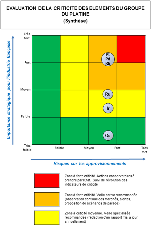 La production de ces métaux s’est considérablement développée ces dernières années en corrélation directe avec le renforcement des normes antipollution et le développement du parc automobile. La production minière a suivi. Il ressort que la criticité du platine, du palladium et du rhodium est très forte, essentiellement en raison de la concentration des lieux de production (Afrique du Sud, Russie) et des fournisseurs. Par ailleurs ces métaux sont difficilement substituables dans leurs usages industriels.