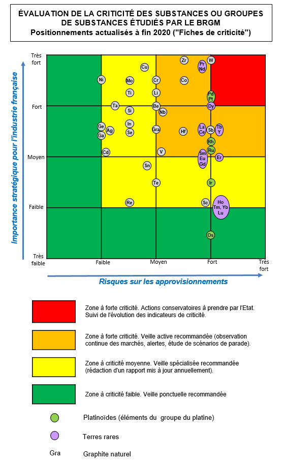 Lorsque la substance est identifiée, l'état et l'évolution des réserves (quantité, concentration géographique, modalités d'exploitation, situation politique,..) et des capacités de première transformation, qui constituent l'offre, sont déterminants. Le potentiel de recyclage et de substitution peuvent mitiger les risques de disponibilité des produits miniers et s'inscrit dans la démarche positive de l'économie circulaire