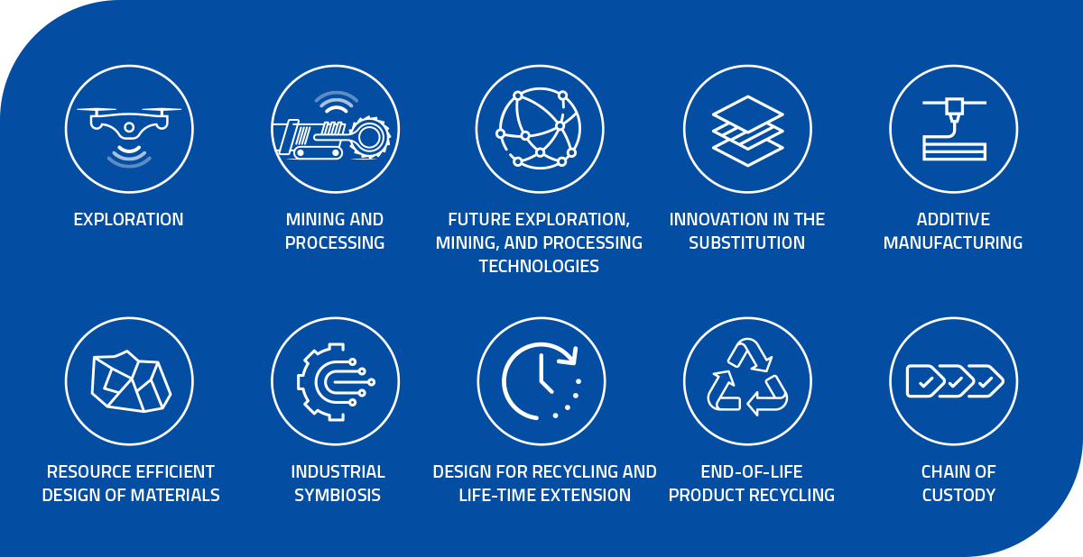 Les propositions de projets doivent répondre aux besoins les plus pressants le long de la chaîne de valeur des ressources minérales afin de renforcer durablement les capacités d'innovation européennes. Les programmes Phares ont ainsi été mis à jour et couvrent également désormais les thématiques : société circulaire, matériaux durables et approvisionnement responsable.