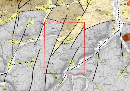 Capture de la carte du périmètre demandé pour permis exclusif de recherches de mines dit "Permis Lopérec 2", sur fond de carte géologique.