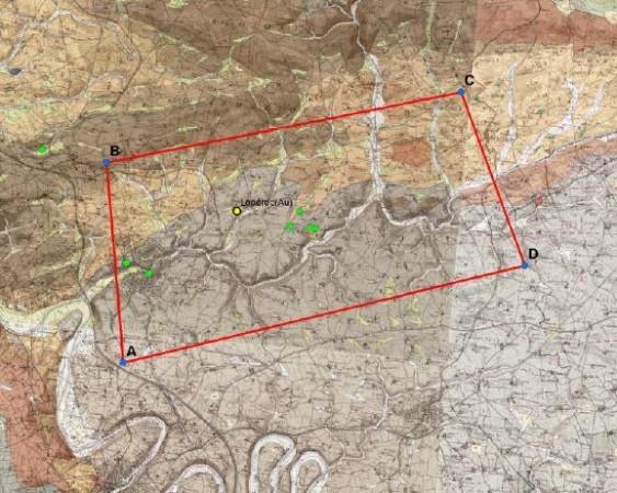 Capture de la carte du périmètre demandé pour permis exclusif de recherches de mines dit "Permis Olivet", sur fond de carte géologique.