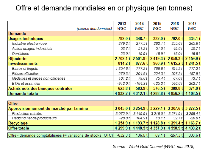 D'après le World Gold Council (WGC, Conseil Mondial de l'Or), la demande en or dans le Monde a été de 4 108 tonnes en 2017. Cette demande a été satisfaite par la production minière (3 272 t nette de hedging2 des producteurs) et le recyclage (1 167 t), soit un total de 4 439 tonnes. La différence de 331 tonnes correspond à des variations de stocks et opérations non comptabilisées (OTC). Les 4 108 t d'or demandées dans le Monde en 2017 ont été utilisées à 52,6 % pour la bijouterie, 30,2 % pour des investissements (lingots, pièces, médailles, ETF et achats des banques centrales), 0,4% par le secteur dentaire et 7,7% par l'industrie, essentiellement dans le secteur de l'électronique.