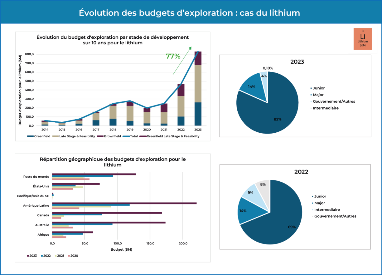 D’importantes augmentations budgétaires ont été observées dans le monde entier, avec en tête l’Amérique latine et plus particulièrement l’Argentine, qui abrite les plus grandes ressources non exploitées de ce métal pour batteries. Parallèlement, la prise en compte de l'impact socio-environnemental de ces exploitations, notamment via l'amélioration de la gestion des ressources en eau dans ces régions désertiques, est devenue un facteur déterminant pour l’acceptabilité et par conséquent le développement de ces projets.