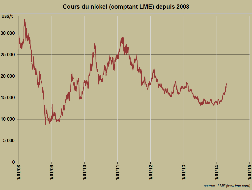 Les cours du nickel ont chuté au cours du premier semestre 2013, passant de 17 310 US$ en moyenne au premier trimestre 2013 (avec un point haut à 18 600 US$ au comptant LME le 4/02/2013) à 13 913 US$/t en moyenne au deuxième semestre 2013 (avec un point bas à 13 160 US$/t au comptant LME le 9/07/2013). A ce niveau, le plus bas depuis 2009, environ 30 % des opérations n'étaient plus profitables. L’interdiction sur les exportations indonésiennes de minerais non transformés, introduite en janvier 2014, a contribué à faire remonter les prix au premier trimestre 2014, à 15 660 US$/t en moyenne sur mars 2014 et même 18 420 US$/t le 24/04/2014.