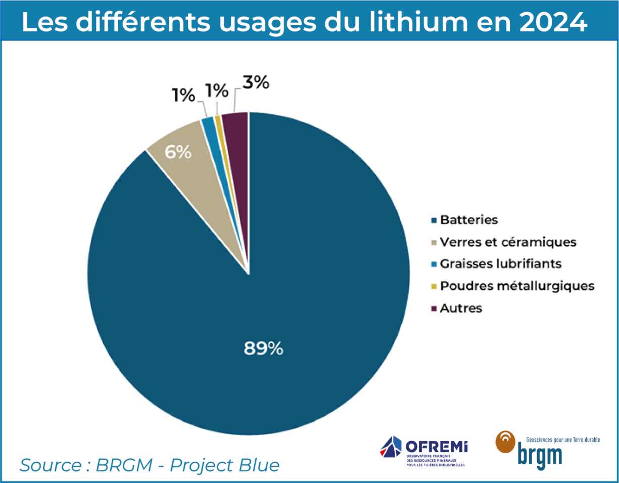 Les usages du lithium ont évolué considérablement au fil du temps. D'abord utilisé dans l'Antiquité sous forme de minerais pour la fabrication de céramiques et de verres, il a gagné en importance au XIXᵉ siècle avec la découverte de ses propriétés chimiques. Au XXᵉ siècle, le lithium s'est imposé en médecine pour traiter les troubles bipolaires et dans l'industrie pour fabriquer des graisses lubrifiantes, des verres et des céramiques résistantes à la chaleur. Sa véritable révolution est survenue avec l'invention des batteries lithium-ion dans les années 1970, commercialisées plus massivement dans les années 1990, et aujourd'hui indispensables pour les appareils électroniques, les véhicules électriques et le stockage des énergies renouvelables. Ces applications modernes en font un matériau stratégique pour la transition énergétique, bien que son extraction pose des défis environnementaux (Collignon & Arnaud, 2024). Le budget annuel mondial consacré à l'exploration du lithium est passé de 857 millions de dollars en 2023 à 1 111 millions de dollars en 2024 contre seulement 164 millions de dollars en 2011 (S&P Global , s.d.). Ce montant est en constante augmentation depuis cinq ans. En 2024, le lithium utilisé dans les batteries représentait 89% des usages, contre seulement 22 % en 2011.