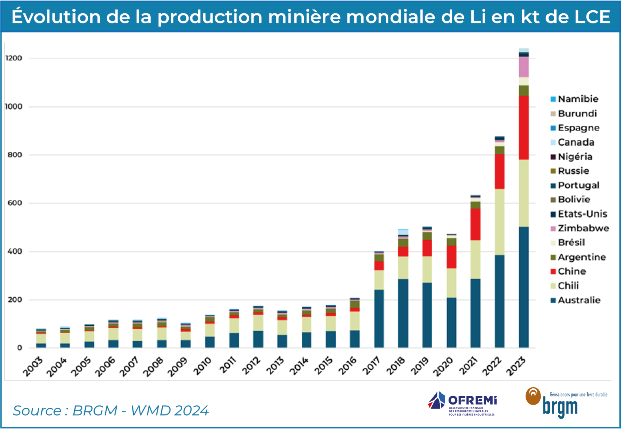 Le marché du lithium connaît une forte expansion, avec une augmentation de la production minière de 18 % entre 2022 et 2023, principalement liée à la demande croissante pour les batteries. Historiquement, le Chili était le principal producteur de lithium jusqu'en 2011, date à laquelle il a été dépassé par l'Australie. Depuis 2018, la Chine a fortement intensifié son extraction de lithium, qui est passée de 38 kt de LCE à 280 kt de LCE en 2023, représentant un facteur 7. Cela fait désormais de la Chine le troisième plus grand producteur mondial de lithium, devant le Zimbabwe, l’Argentine et le Brésil.