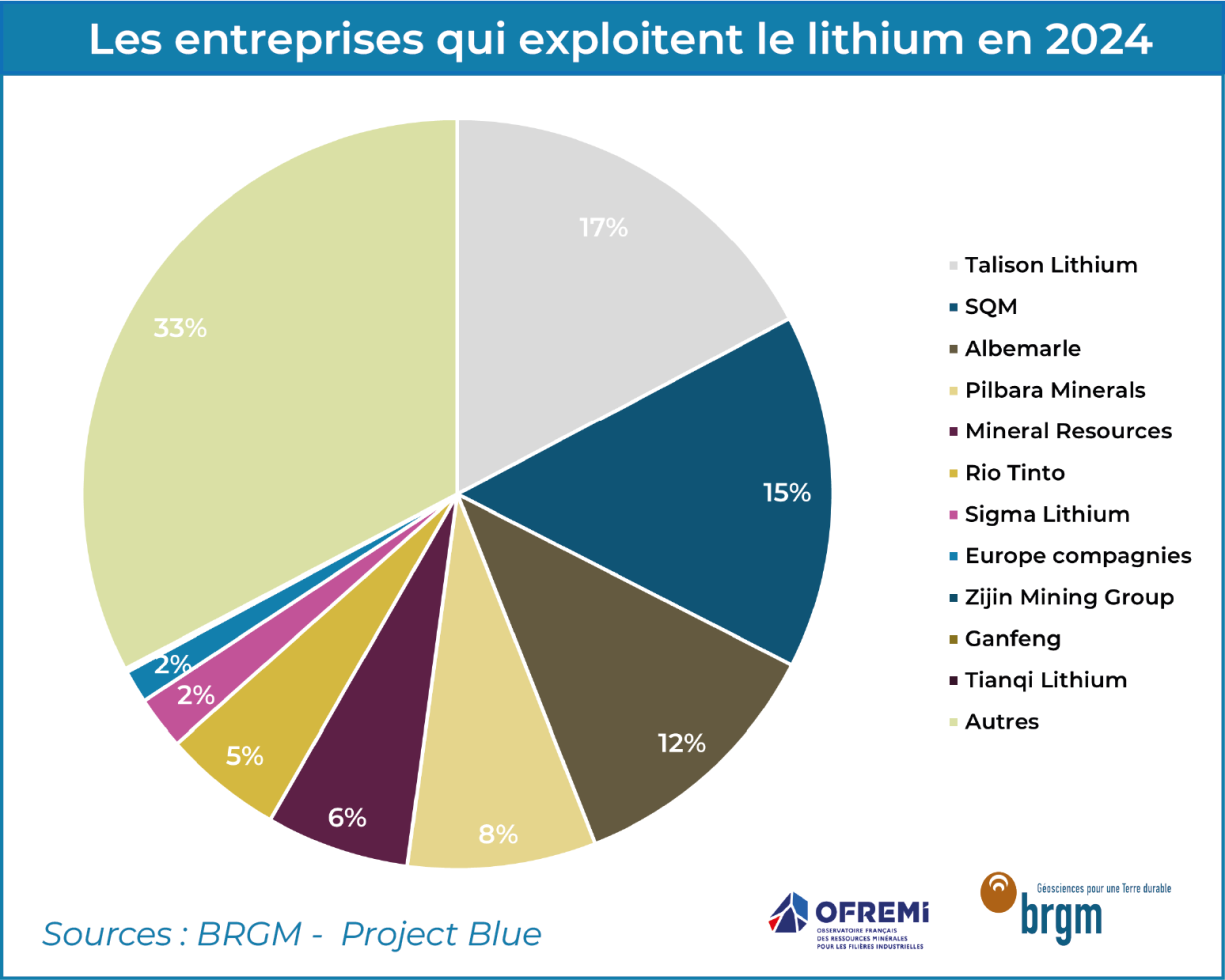 - Pilbara Minerals est une entreprise australienne, dont 6 % des actions sont détenues par le groupe chinois Ganfeng Lithium. Elle exploite la mine de roche dure de Pilgangoora en Australie, où elle produit du concentré de spodumène et de tantalite. En 2023, sa production totale de lithium a atteint 82 kt de LCE.