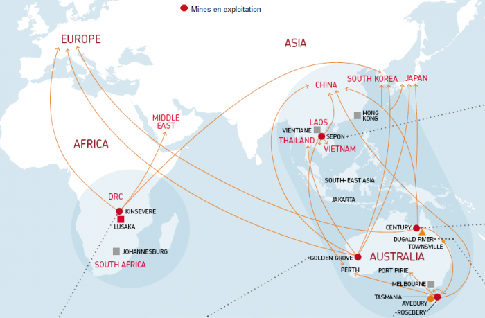 MMG est un des plus gros producteurs mondiaux de zinc avec une production de 600 kt (métal contenu) en 2013 issue de ses trois mines australiennes : Century, dans le Queensland, qui a produit 488 kt de zinc (métal contenu), mais qui devrait fermer courant 2015 ; Rosebery (88 kt de zinc, métal contenu) en Tasmanie et Golden Grove (23 kt, métal contenu) en Australie Occidentale. La société opère également la mine de cuivre de Sepon (90 kt, métal contenu) au Laos et Kinsevere en République Démocratique du Congo (62 kt de cuivre cathode).