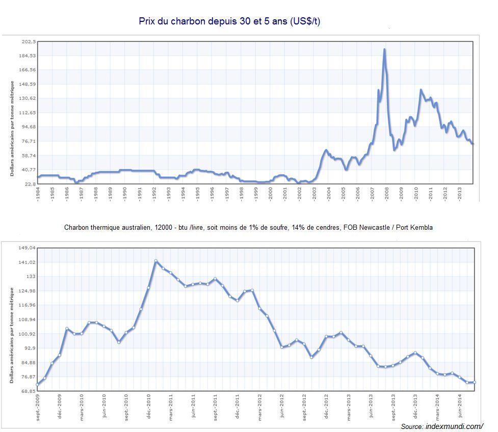 - Le charbon thermique est en crise, avec une chute des cours, victime collatérale aux Etats-Unis du succès du gaz de schiste qui le substitue dans les centrales thermiques. Le charbon américain inutilisé se retrouve ainsi sur le marché international, faisant chuter les cours et annuler de nombreux gros projets miniers (Mozambique, Australie, etc.). L’inde, dont le déficit en charbon est particulièrement critique, est très présente dans cette redistribution des cartes.