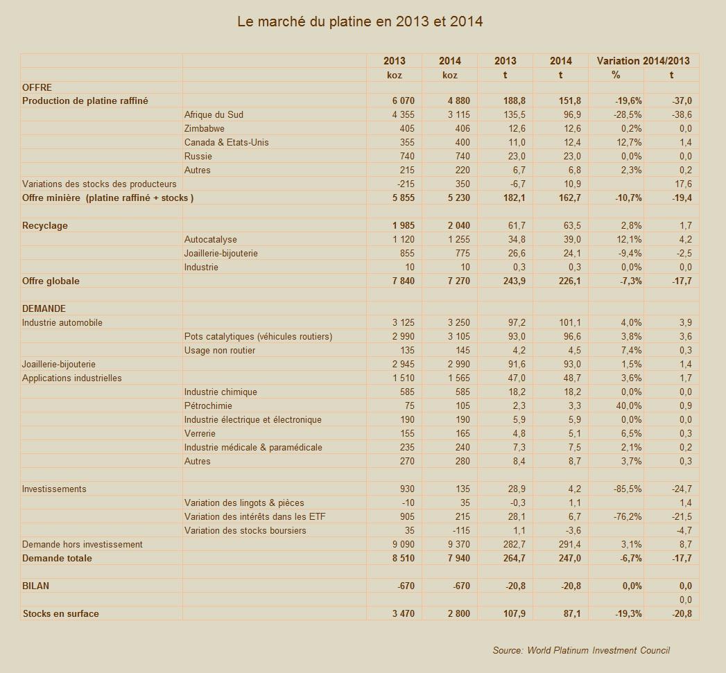 L’offre globale pour l’année 2015 devrait retrouver son niveau de 2013 avec le retour à la normale de la production minière sud-africaine, et la demande hors investissement devrait poursuivre sa croissance. La demande pour la catalyse automobile sera soutenue en Europe par l’entrée en vigueur de la norme automobile européenne Euro 6, en septembre 2014. Les nouveaux pots d’échappement contiendront en effet plus de platine. Selon le WPIC, le marché du platine devrait rester en déficit en 2015 (<6 t).