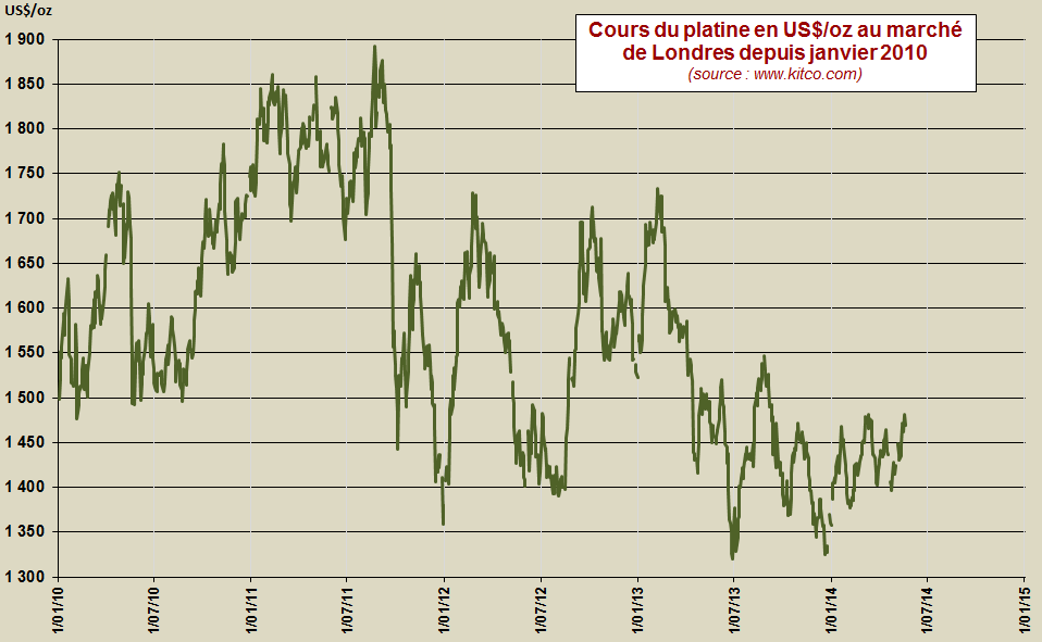 Les cours du platine ont grimpé en début d’année 2013, en raison notamment des inquiétudes concernant l’approvisionnement en minerai sud-africain qui avait été perturbé par des grèves au dernier trimestre 2012. L’once de platine s’échangeait à plus de 1 700 US$/oz en février 2013, avec un haut à 1 736 US$/oz ( le 7/02/2013 après-midi), son niveau le plus élevé depuis 16 mois ½, avant de chuter à près de 1 300 US$/oz en juin 2013. En 2013, la moyenne du prix du platine a été de1 486 US$/oz, la plus bassee depuis 4 ans. Puis dans les cinq premiers mois de 2014, le prix du platine a oscillé entre 1 380 et 1 480 US$/oz.