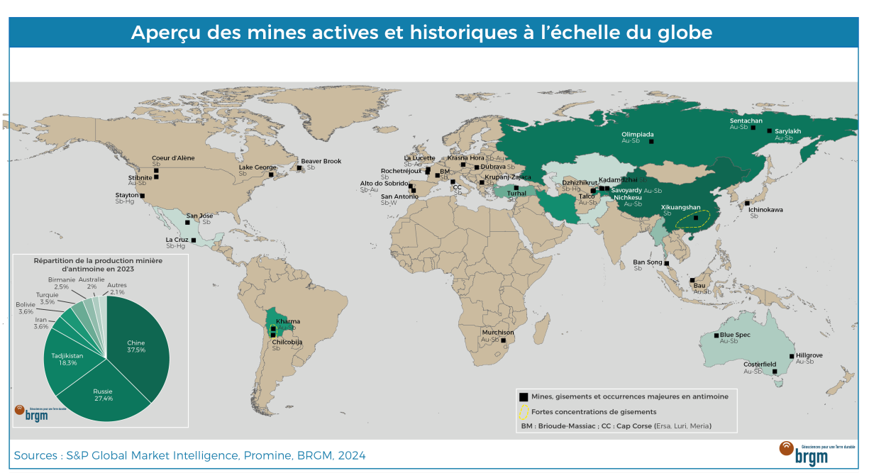 Au début du 20e siècle, la France figurait parmi les principaux producteurs mondiaux d'antimoine, notamment grâce aux mines de La Lucette (53) et de Rochetréjoux (85), ainsi qu'à celles du district de Brioude-Massiac (42). Aujourd'hui, cependant, la production minière française et européenne d'antimoine a disparu. L'Afrique du Sud, autrefois un acteur majeur, a cessé sa production en 2014, tandis que les États-Unis et le Canada ont arrêté respectivement en 1992 et 2012. L'Australie continue de produire de l'antimoine, mais uniquement en tant que coproduit de sa mine d'or de Costerfield.
