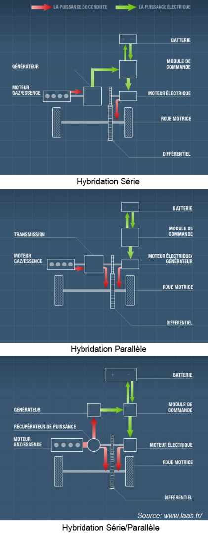 Hybridation série : les moteurs thermiques et électriques sont totalement dissociés. Le moteur thermique alimente un générateur électrique. Celui-ci fournit la puissance au moteur électrique, qui assure seul la propulsion des roues, ainsi qu’à la batterie de stockage, qui récupère également l’énergie dégagée lors des freinages et des décélérations du véhicule.