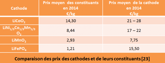 Batterie Lithium-ion pour les véhicules hybrides : les électrodes positives utilisées sont principalement de trois types : sous forme d’un oxyde stratifié (technologies “NCA” pour Nickel-Manganèse-Aluminium LiNi0,8Co0,15Al0,05O2 et “NCM” LiNi1/3Co1/3Mn1/3O2), d’un polyanion (technologie “LFP” pour Lithium-Fer-Phosphate LiFePO4), ou d’un spinelle (technologie “LMO” pour Lithium-Manganèse-Oxyde LiMn2O4). L’électrode négative est majoritairement du graphite, mais une technologie alternative, mise sur le marché en 2008 par Toshiba, repose sur du titanate de lithium (technologie “LTO” pour Li4Ti5O12). Enfin, l’électrolyte est un solvant organique, généralement de l’éthylène carbonate, du diméthylcarbonate ou du diéthylcarbonate, contenant des complexes inorganiques de lithium tels que le lithium hexafluorophosphate (LiPF6), hexafluoroarsenate (LiAsF6), perchlorate (LiClO4), tetrafluoroborate (LiBF4) et triflate (LiCF3SO3). L’ensemble des électrodes et de l’électrolyte est placé entre deux collecteurs de courant généralement composés d’aluminium et de cuivre.