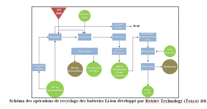 Ce procédé est mis en œuvre par Retriev Technology (anciennement Toxco), société canadienne associée dans une joint-venture avec le principal recycleur de batteries des Etats-Unis, Kinsbursky Brothers Inc. Il repose sur un broyage en deux étapes des batteries afin d’atteindre la maille de libération des plastiques et des métaux, puis la séparation des métaux grossiers des plastiques au moyen de tables à secousses, et de la récupération des fines métalliques par filtration [21]. Pour 907,4 kg de batteries, 227 kg d’un assemblage de cobalt et de cuivre, et 30 kg de Li2CO3. Pour rappel, la batterie Li-ion équipant le modèle Leaf de Nissan pèse environ 200 kg. Le recyclage des batteries NiMH est réalisé par désassemblage manuel, suivi d’un broyage des plastiques, la récupération et la neutralisation de l’électrolyte alcalin, et la récupération des terres rares. Les plaques de nickel sont envoyées dans une fonderie pour former de l’acier [22].
