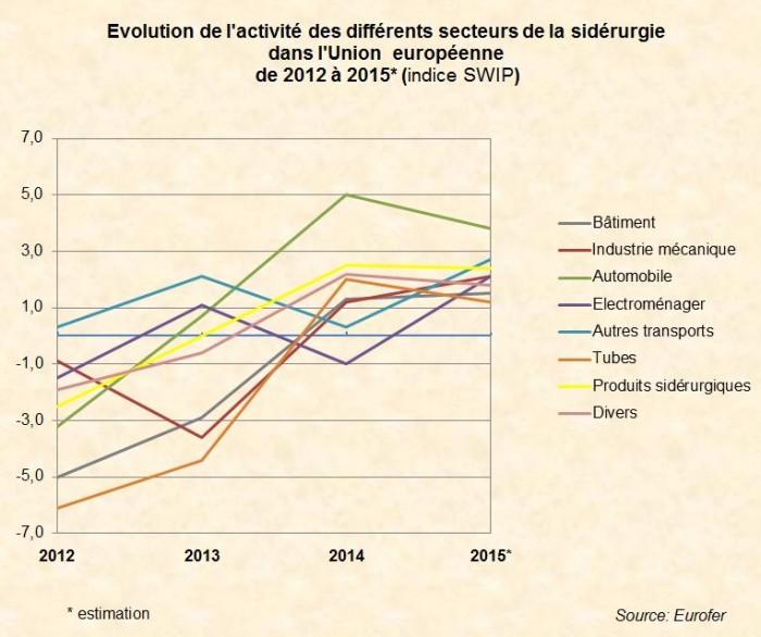 Selon le rapport d’Eurofer publié le 6 février 2015, l’activité des secteurs consommateurs d’acier dans l’UE a progressé de 2,2 % (Index SWIP2) en 2014. Le rebond de l’activité initié au cours du 1er trimestre 2014 dans tous les secteurs a faibli au second semestre.