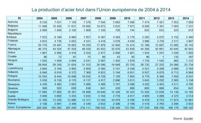 La production a progressé de 1,8 % atteignant 169,1 Mt (Eurofer, l’association européenne des producteurs d’acier), un niveau qui reste cependant inférieur de 17 % à la moyenne de la production annuelle de la période 2004-2008 (203 Mt). Le poids de l’Union européenne dans la production globale d’acier est passé de 15,3 % en 2008 à 10,2 % en 2014.