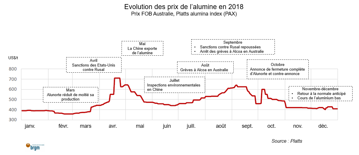 La réduction de la production brésilienne ainsi que les incertitudes autour des sanctions états-uniennes ont propulsé les prix de l’alumine à des niveaux sans précédent, hors-Chine. Le prix de l’alumine australienne (prix moyen mensuel FOB), qui se situait à environ 400 US$/t en janvier 2018, a dépassé 700 US$/t suite à l’annonce des menaces de sanctions contre Rusal en avril, introduisant ainsi un arbitrage profitable pour les raffineurs chinois. L’arrivée de l’alumine chinoise sur le marché occidental a tempéré la situation, mais une forte volatilité des prix a cependant été maintenue jusqu’en octobre par les grèves dans les usines (AWAC) en Australie occidentale, les contrôles environnementaux en Chine et diverses annonces. Le marché s’est toutefois calmé en fin d’année avec l’intensification des exportations chinoises et les perspectives de résolution des sanctions états-uniennes et de reprise de la production à pleine capacité de la raffinerie d’Alunorte au Brésil en 2019. Les prix ont retrouvé leur niveau de base entre 350 et 400 US$/t et ont, somme toute, peu réagi à l’annonce de la levée des sanctions à l’encontre de Rusal le 27 janvier 2019 (364 US$/t le 1er février 2019) et du report du retour à la normale à Alunorte.