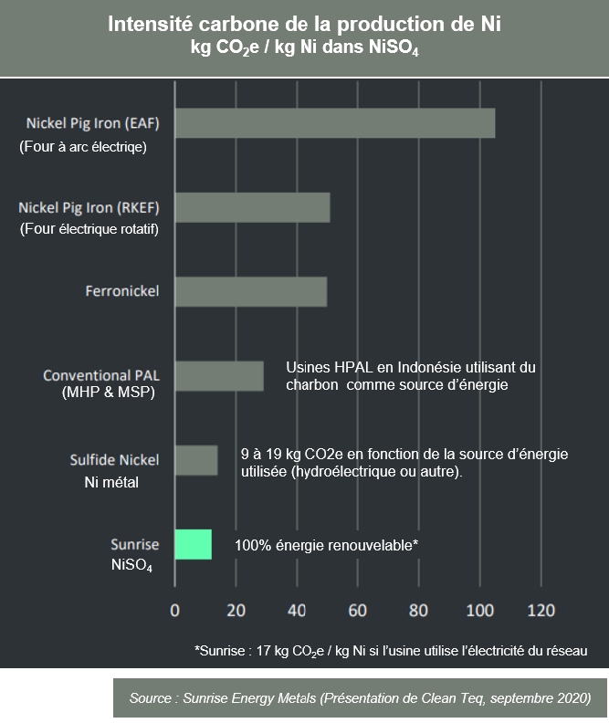 Les références ESG constituent une opportunité pour les juniors minières en suscitant un regain d’intérêt des investisseurs pour des projets d’exploration de gisements sulfurés et accélérer le développement de projets en cours, comme ceux de Turnagain (GigaMetals) en Colombie britannique, Crawford (Canada Nickel) en Ontario et Dumont (Magneto Investments) au Québec. En Australie, ce seront les projets de traitement de latérites qui porteront cette tendance. Sunrise Energy Metals annonce une empreinte carbone faible pour le nickel qu’il produira directement sous forme de sulfate à partir de minerai latéritique, en Nouvelle-Galles du Sud.