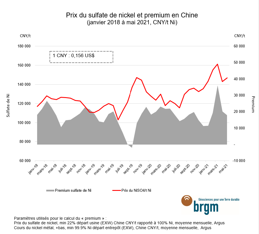 Le prix moyen du sulfate de nickel (22 % Ni minimum, ex-works Chine c’est-à-dire au départ d’usine) en Chine s’élevait à 32 290 yuan/t en mai 2021 (5 011 US$/t, moyenne calculée à partir des prix relevés sur le marché chinois11).