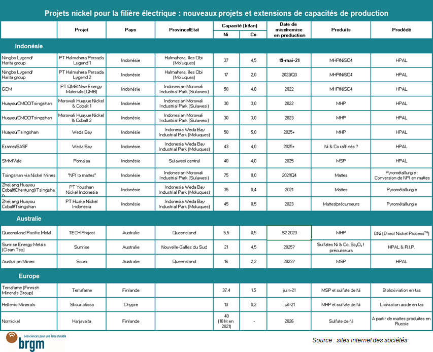 Avec plusieurs projets HPAL bien avancés, l’Australie, premier producteur mondial de lithium, renforce sa position de fournisseur de matières premières pour les cathodes des batteries Li-ion. L’usine HPAL de Ravensthorpe en Australie a été remise en production (MHP) en 2020 et Nickel West, la filiale nickel de BHP Billiton, lancera une production de sulfate de qualité batterie en 2021. Nickel West produira du sulfate par dissolution de poudres et briquettes issus de sa raffinerie de Kwinana, en Australie Occidentale, avec une capacité initiale de 100 kt/an (soit 22 kt Ni/an). D’autres projets HPAL sont en cours de développement, celui de Sunrise (Sunrise Energy Metals, anciennement Clean Teq) en Nouvelle-Galles du Sud, et celui de Sconi (Australian Mines) au Queensland qui ont la particularité de traiter des minerais riches en cobalt et scandium, un atout économique certain. Sunrise, le projet le plus avancé, produira des sulfates de Ni et de Co de qualité batterie sans passer par l’étape des produits intermédiaires (MHP/MSP), ainsi qu’un oxyde de scandium (Sc2O3)19. De son côté, Queensland Pacific Metal (TECH Project) traitera du minerai néo-calédonien par un procédé de lixiviation à l’acide nitrique (DNi) pour obtenir des MHP, ainsi que de l’alumine de haute pureté dès 2023.